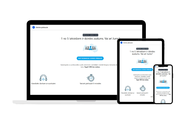 Izveido profilu ➝ Uzvelc austiņas ➝ Pārbaudi dzirdi ➝ Saņem rezultātus